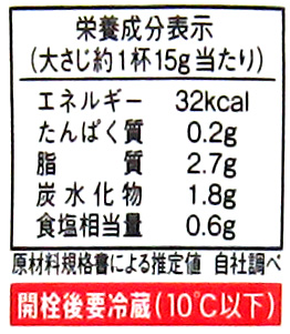 大さじ一杯(15g)当たり:エネルギー32kcal、たんぱく質0.2g、脂質2.7g、炭水化物1.8g、食塩相当量0.6g